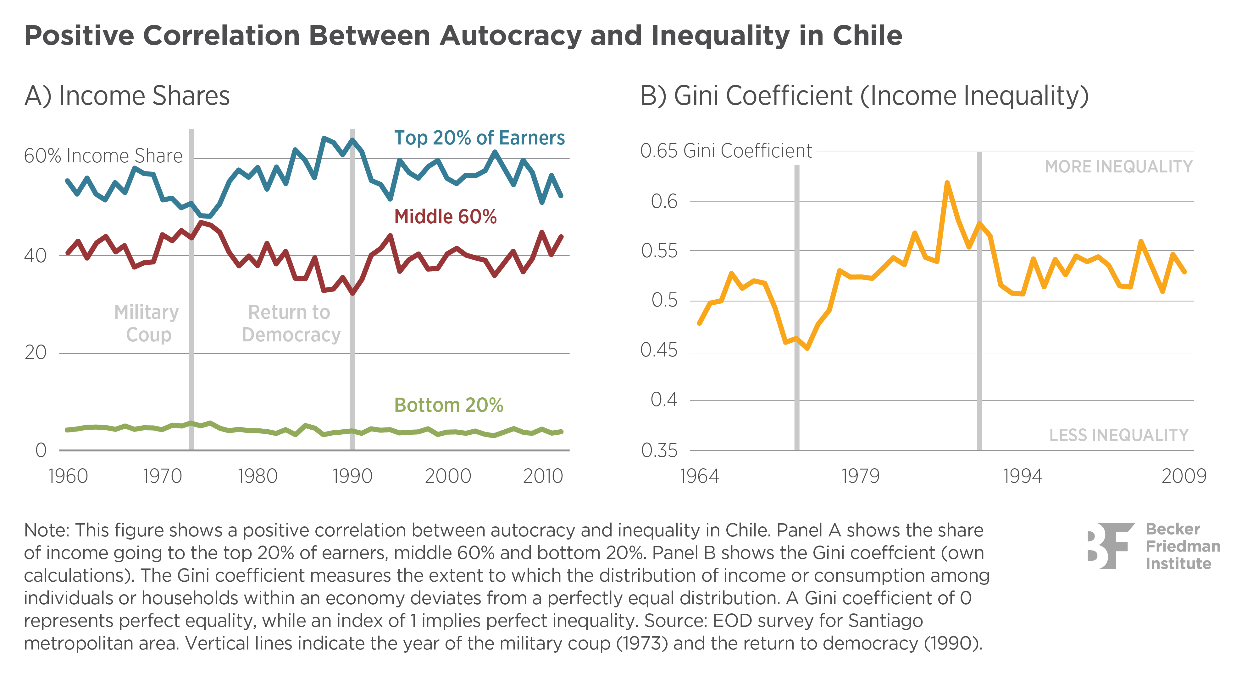 - Using survey data spanning more than 50 years, the authors find that the share of income accruing to the middle-class correlates positively with democratic rule in the periods before, during, and after Pinochet. These changes came at the expense of the rich with no change for the poor, lending support to the hypothesis that regime change mostly affects the middle class.