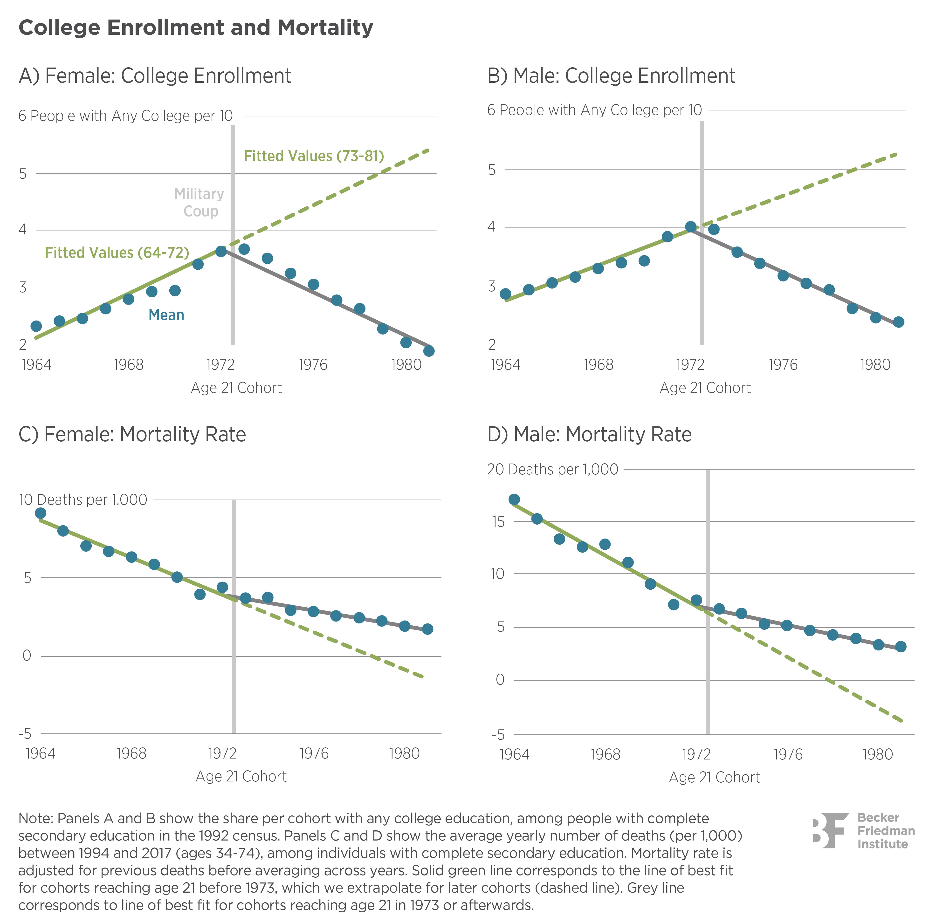 - Accounting for region-by-year and age fixed effects, yearly deaths per 1,000 increase by 0.11 for each additional female cohort reaching college age after 1973. For men, mortality increases by 0.31 deaths per 1,000 for each post-coup cohort. These effects are equivalent to 2.9% and 4.4% of the respective sample means. These effects are largely driven by deaths from cancer and diseases of the circulatory or digestive systems.