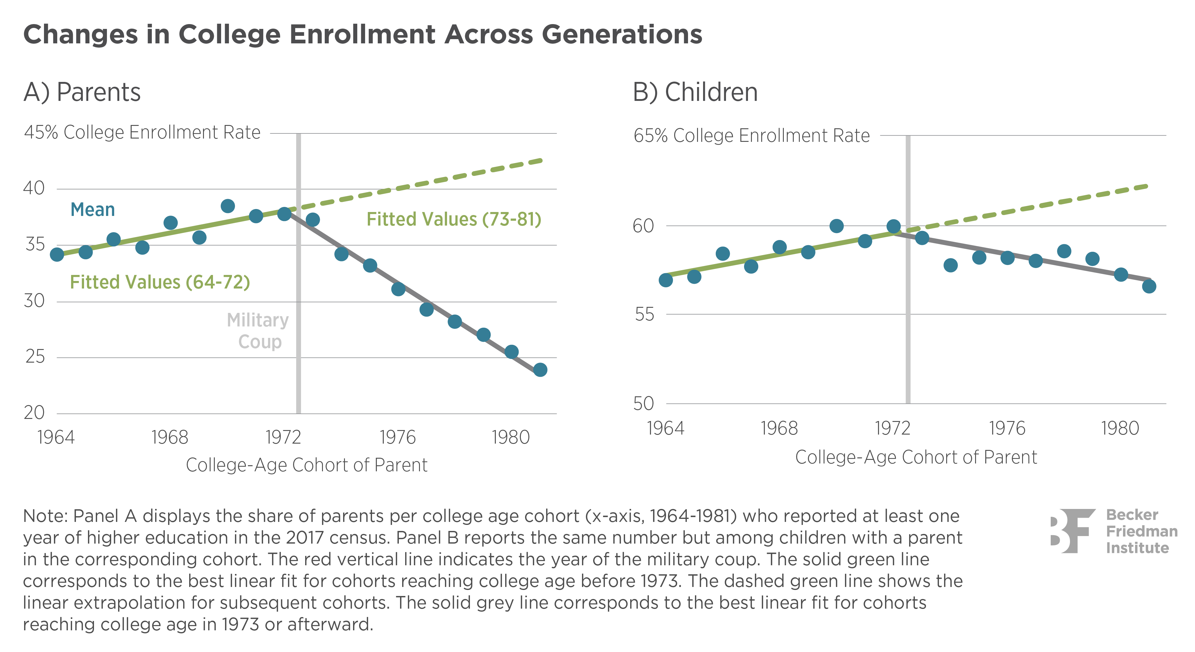 Bottom line: Higher education impacts social mobility, and political regimes can have an outsized effect on supplying higher education, especially for the middle class. In the case of Chile, individuals who reached college age shortly after the military coup experienced a sharp decline in college enrollment, had worse economic outcomes throughout the life cycle, and struggled to reach the top of the socioeconomic ladder.
