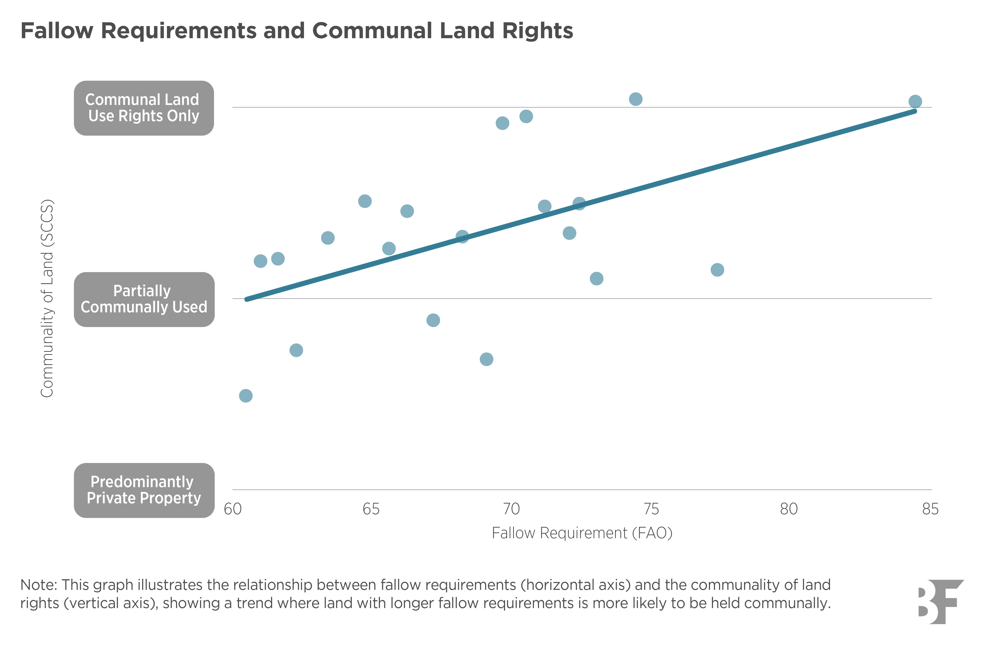 Places where land needs to be fallowed for longer periods are more likely to have communal property rights, both historically and presently. World Bank land titling interventions are less effective in places with longer fallow requirements, and longer fallow periods are associated with less inequality, less conflict, and greater resilience to negative shocks.