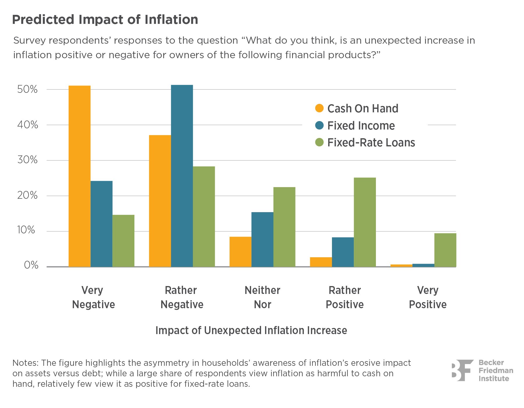 - While households are well aware of inflation’s erosive impact on assets, they tend to be less aware that inflation also erodes debt. Seventy- five percent of respondents believe the impact of unexpected inflation on fixed-rate savings products is very negative or negative. However, only 9% of respondents believe the impact of unexpected inflation on fixed-rate loans is very positive and 25% believe it is positive.