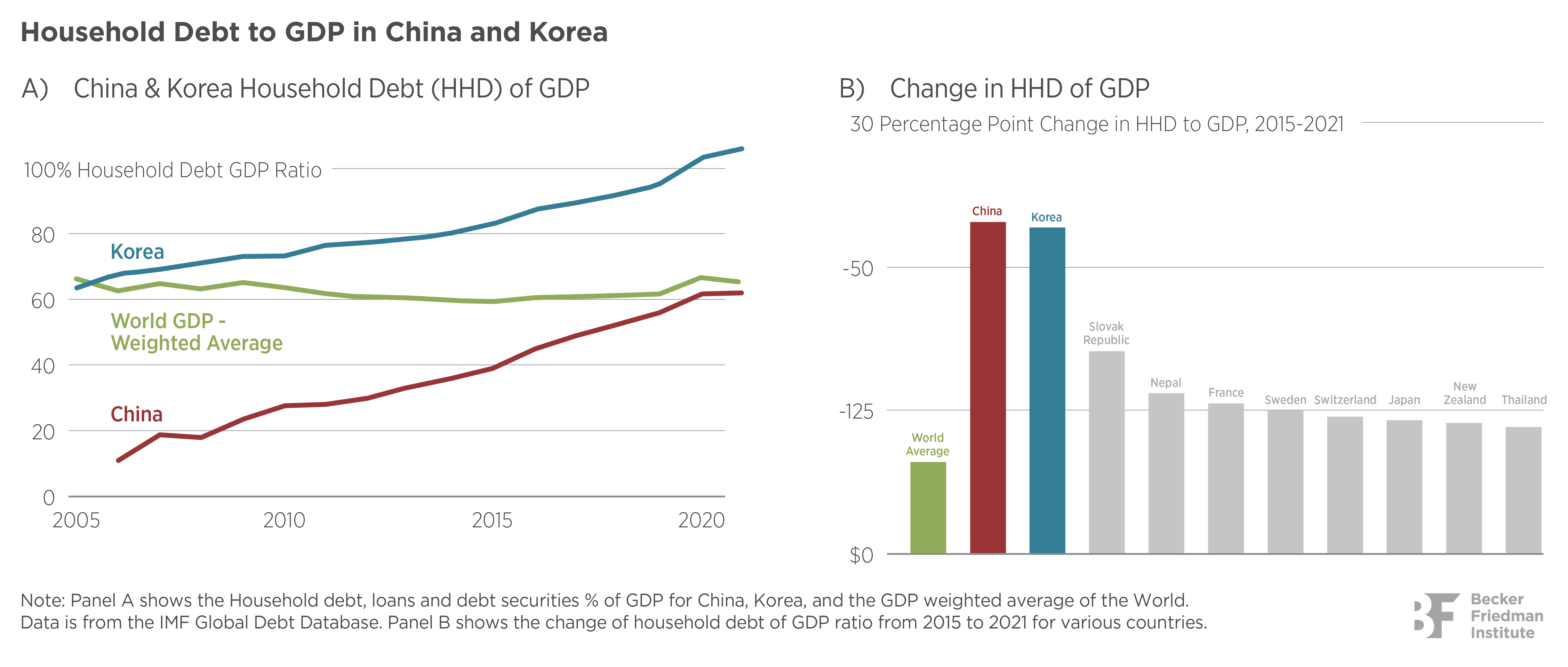Research on this economic phenomenon has largely focused on advanced economies from 1967 through 2012, but recent studies have expanded to include emerging markets and other countries. Of particular concern in recent years is the significant rise in the household debt to GDP ratio in China and South Korea, which are the largest and fourth largest Asian economies. These two countries are seemingly in the later phase of a debt driven boom-bust pattern as both are currently experiencing a housing market correction and slowdown in growth. This has spurred questions about the impact of the housing market troubles on broader economic activity, including the potential impact on the Asian and world economies.