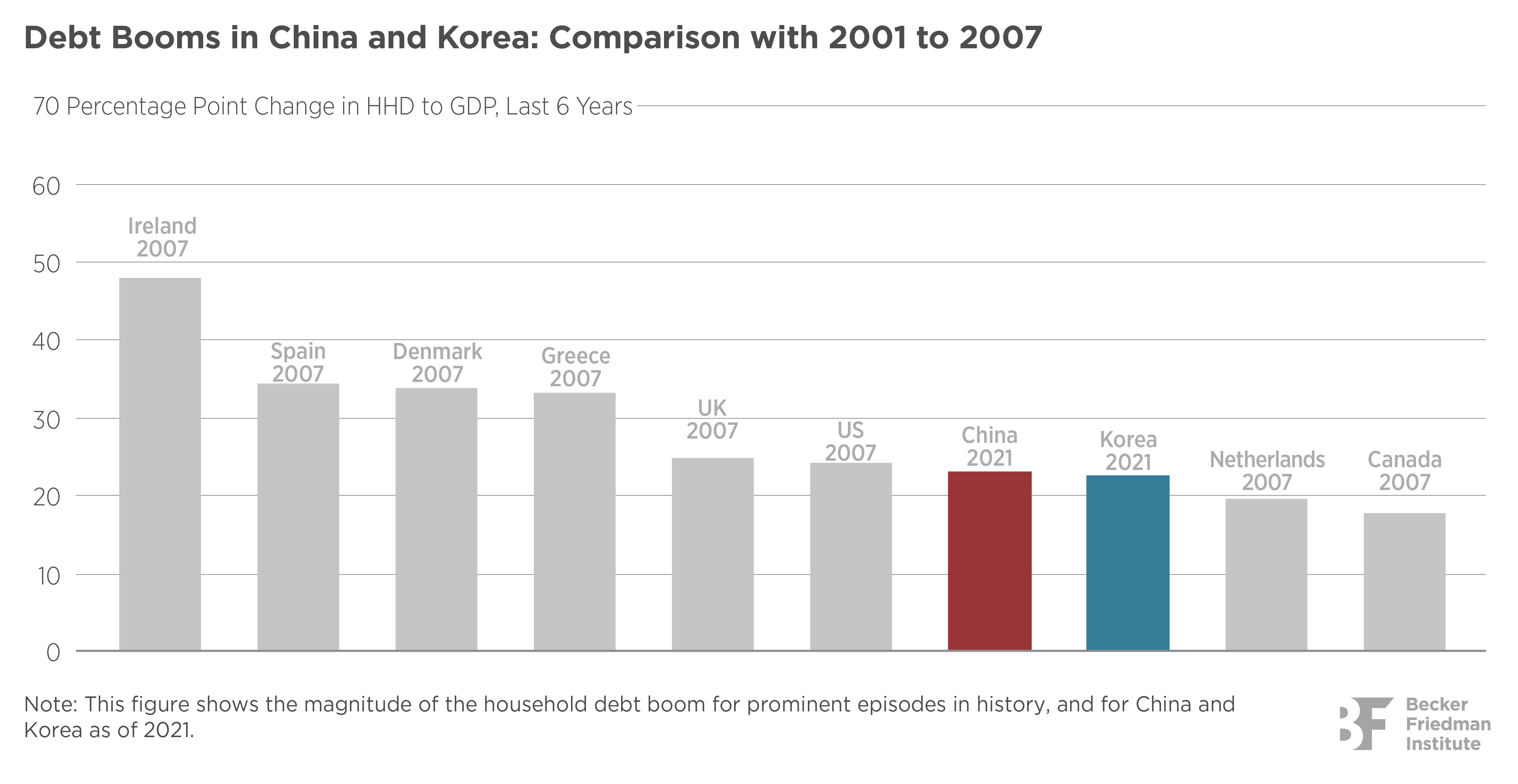 Figure 2 shows the Chinese and Korean household debt boom of 2015 to 2021 compared to some of the classic booms prior to the Great Recession. The 23-percentage point rise in the household debt to GDP is smaller than some of the largest booms prior to the Great Recession, but the Chinese and Korean booms are comparable with the booms that occurred in the United States and United Kingdom from 2001 to 2007.