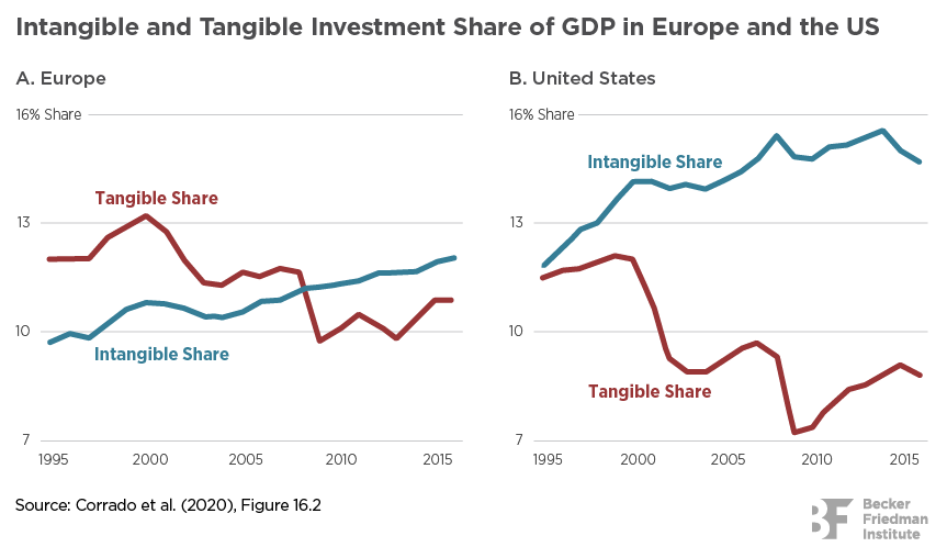 What is the full value of brand capital for a firm? Not surprisingly, this is not an easy question to answer. To do so, one must devise a counterfactual scenario that imputes or estimates what a firm’s profits would be absent the intangible capital. In such a counterfactual world, do the brand and its trademarked brand elements cease to exist? If so, does the firm build or acquire a different brand? Or does the brand get transferred to another (competitor) firm? Regardless, the profit stream in this counterfactual world must be estimated. To approximate this value, the authors utilize data from a private vendor to estimate the value of the 100 most valuable brands at $4.14 trillion in 2021, with brand value rising from 29 percent of property, plant, and equipment in 2007-2009 to 47 percent in 2018-2020.