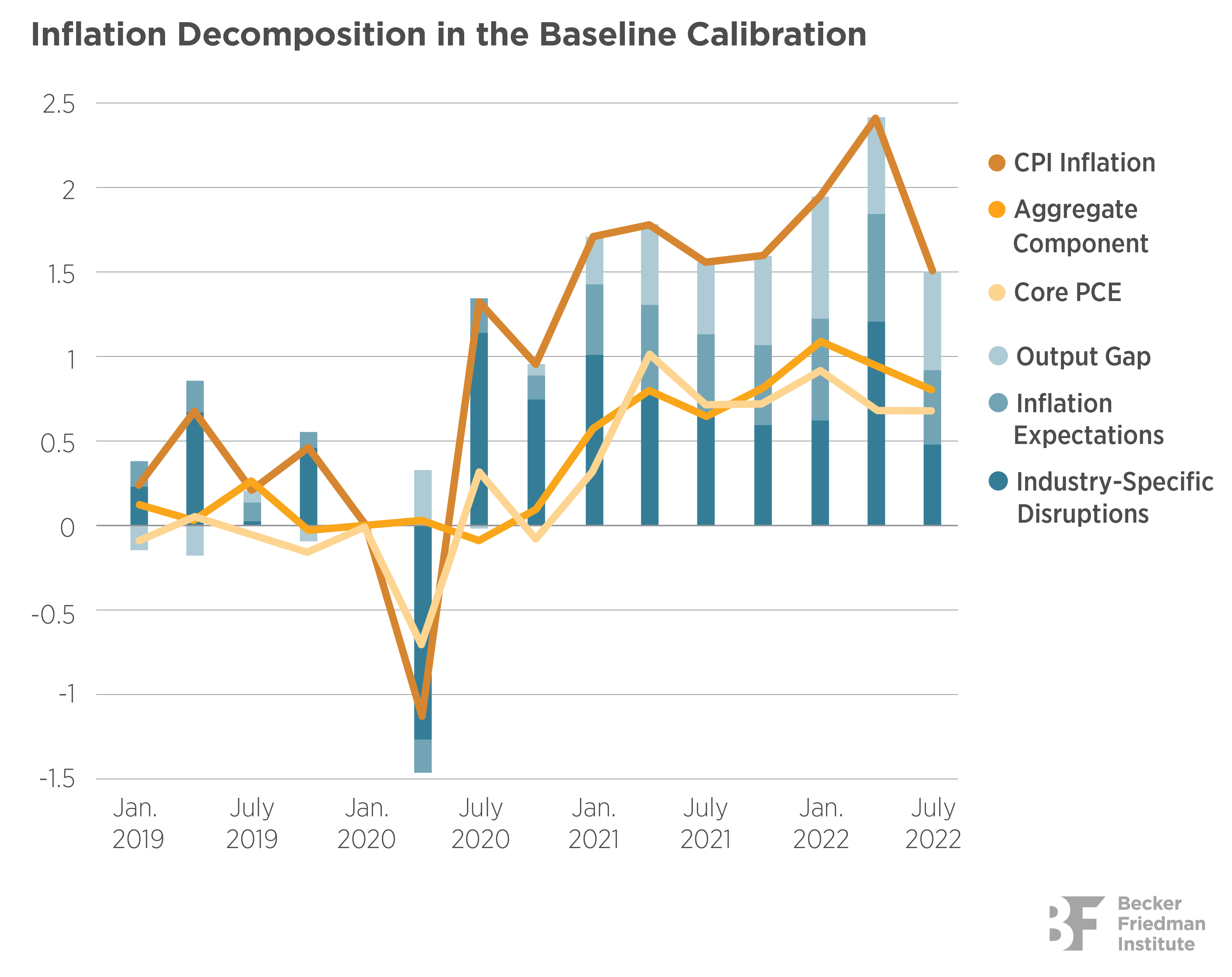 In the Figure, Rubbo decomposes the consumer price index (CPI, rust line), into the components driven by output gaps (lighter bars) and industry-specific disruptions (dark blue bars). What the author dubs the Aggregate Component (orange line) is equal to the difference between the actual CPI inflation and the counterfactual inflation that would have prevailed had the Fed always kept a zero-output gap. We can see that the CPI was almost entirely driven by Industry-Specific Disruptions in the early phase of the Covid pandemic (from February to October 2020). Instead, the Aggregate Component explains a large fraction of CPI inflation after January 2021, meaning that loose monetary policy and stimulus policies are responsible for a sizable share of CPI inflation. Nonetheless Industry-Specific shocks still have an important role, likely due to higher energy prices. The personal consumption expenditure price index (core PCE, yellow line in the Figure) is effective at filtering out the effect of energy prices on CPI inflation, but it overstates the Aggregate Component in the early phases of the pandemic.