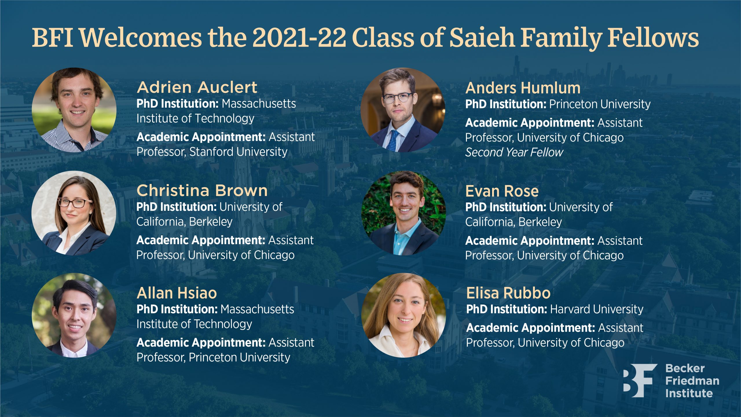 The Becker Friedman Institute for Economics at the University of Chicago (BFI) is pleased to announce this year’s Saieh Family Fellows in Economics. For the 2021-22 academic year, six early-career economists will join the prestigious fellows program, which brings together leading, early-career economists to take part in the University’s field-defining approach to economic scholarship.